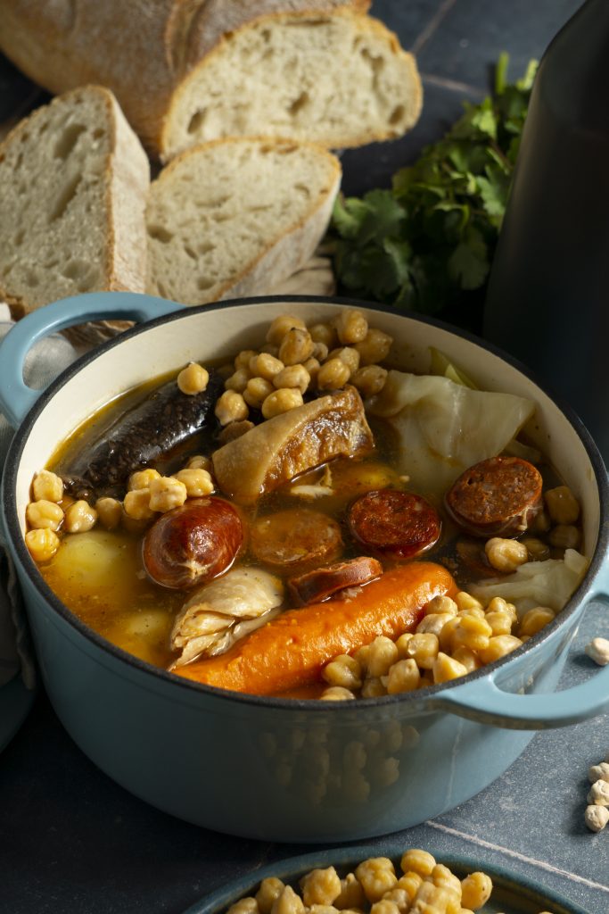 El Cocido Madrileño es, quizás, el guiso más emblemático y complejo de nuestra gastronomía. Es mucho más que un plato de garbanzos; es una experiencia culinaria que se disfruta en tres «vuelcos». Su legumbre principal es el garbanzo, y su clave reside en la calidad del caldo y los diferentes tipos de carne (morcillo, tocino, chorizo, morcilla). Es el clásico ineludible al buscar recetas de garbanzos con carne.
