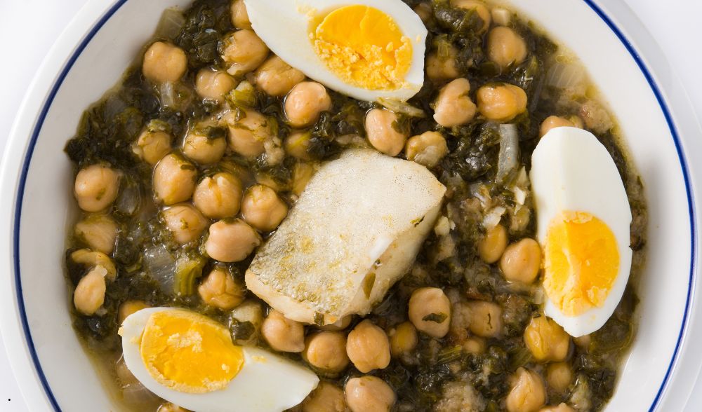 Aunque tradicionalmente se asocia a la Cuaresma, este potaje es una maravillosa opción vegetariana o con bacalao para cualquier día frío. Es un plato más ligero donde los garbanzos se combinan con espinacas frescas y un majado de pan y frutos secos. Ideal para usuarios que buscan recetas con legumbres sin carne o potajes saludables.
